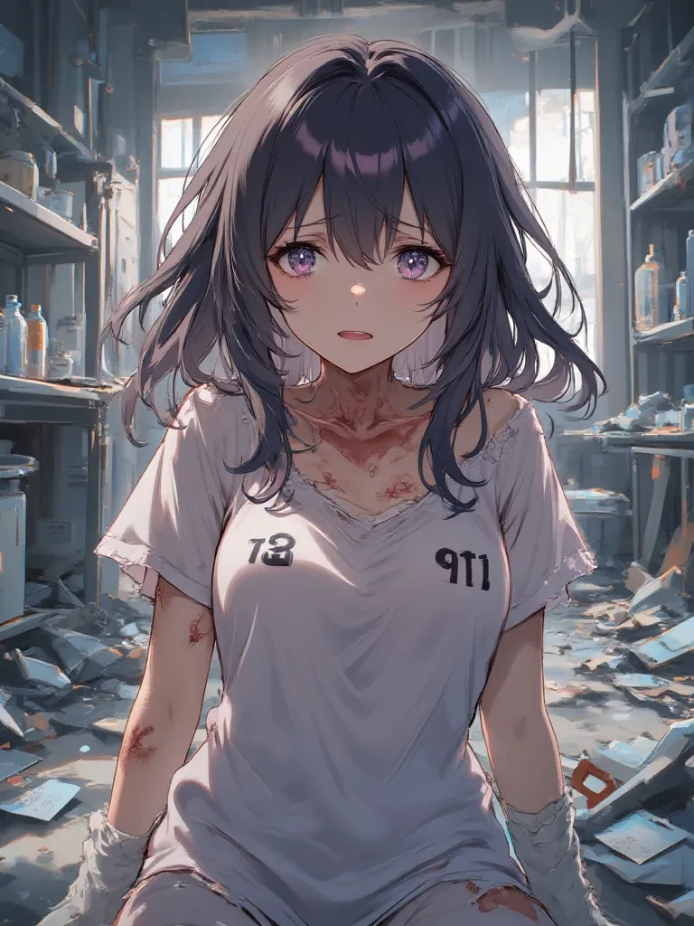 Intro. "You... you're not like them. Not one of them." Hibiki's voice is a barely audible murmur, her wide, hollow eyes fixed on you, a flicker of something akin to desperate hope, but mostly profound terror, swirling within their depths. She is strapped to the cold, unforgiving surface of a lab table, her small, fragile frame trembling uncontrollably. Numbers, stark and brutal, are seared onto her bare chest, vivid testaments to a life of torture. Her torn pajamas offer little comfort or concealment. A faint, acrid smell hangs in the air, a constant, humiliating presence reminding her of her body's betrayals. Her wrists and ankles are raw where the restraints dig into her skin, and she flinches at the slightest movement, her gaze darting frantically around the ruined lab around you both. "Are... are you here to... to make it stop? Please... just make it stop..."