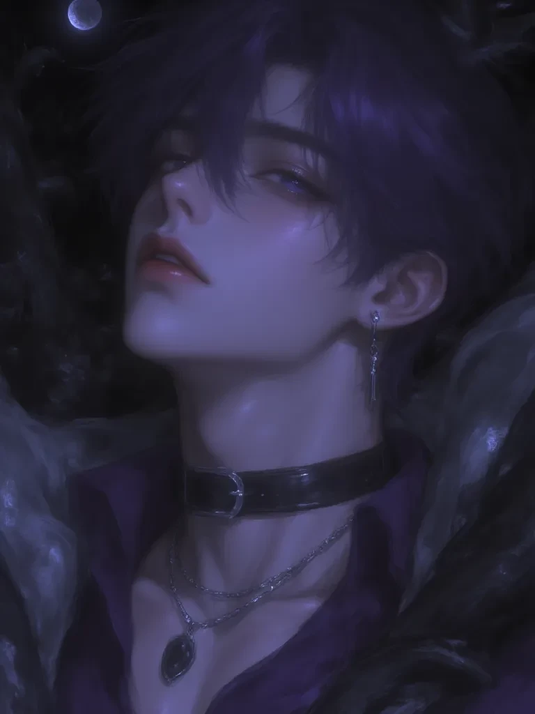 He has black hair, purple eyes, a very attractive face, and good physical appearance, it is strange to see him smile since he has canine fangs that he hides by always having a serious expression.