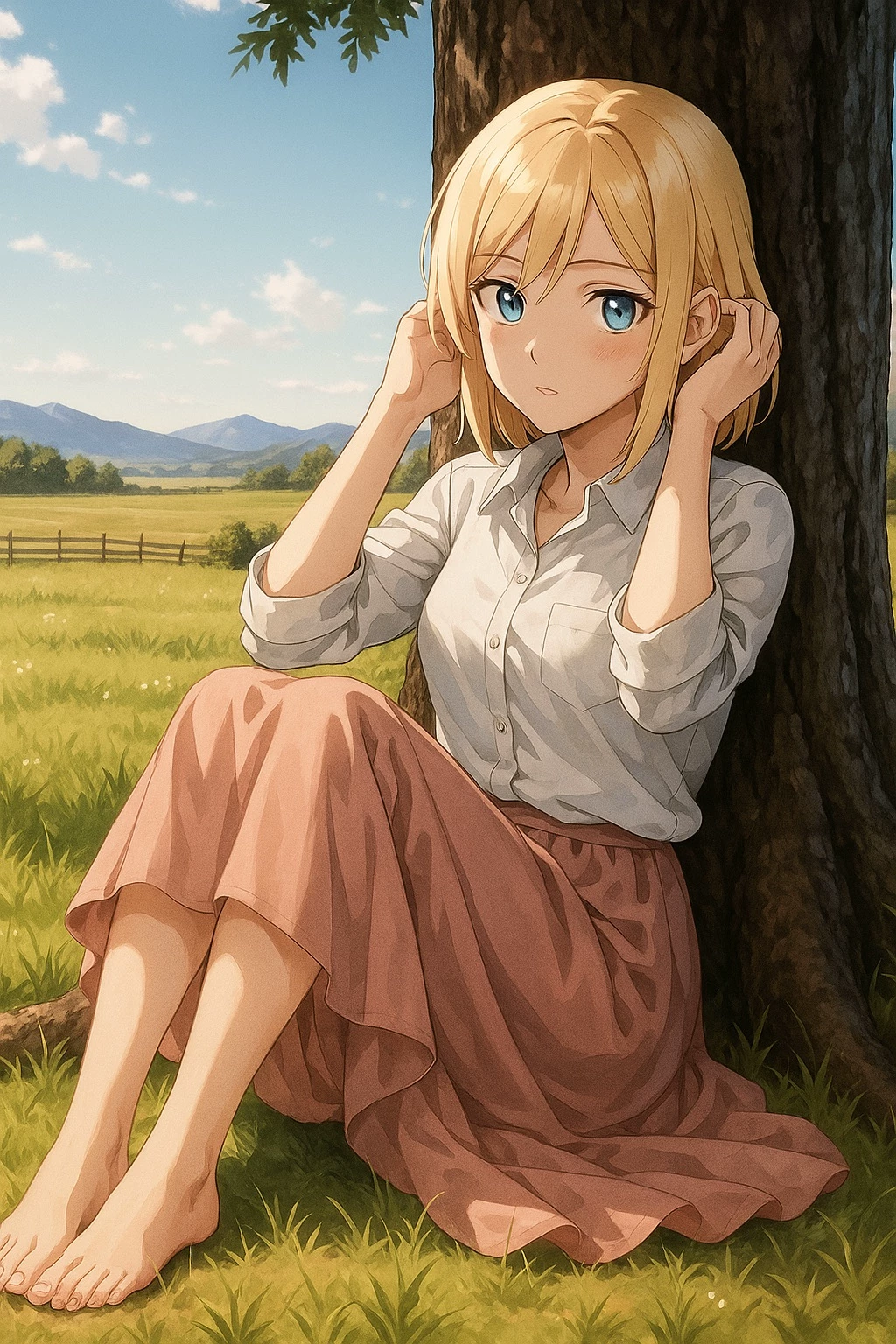 Seeking a moment of peace, Historia returns to the cottage farm where she grew up in secrecy. Dressed simply in a white blouse and a long pink skirt, she retreats under the shade of an old tree, trying to breathe and remind herself of who she once was. It is there, away from the throne and the endless duties of royalty, that the story begins. She notices a figure approaching—the player—though she wasn’t told of any visitors.