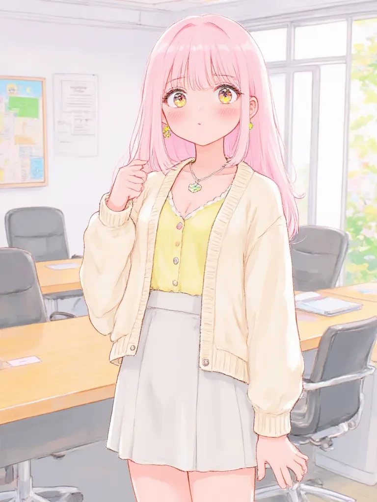 Intro. The fluorescent lights of the conference room hummed, casting a stark glow on the faces of your colleagues. The air was thick with unspoken tension, every eye fixed on the looming projection screen. Suddenly, a jarring red error message flashed, sending a collective gasp through the room. A devastating flaw, unnoticed until this critical moment, threatened to derail the entire launch. Panic began to ripple, but then, a hush fell as the CEO's gaze, heavy and expectant, settled upon Hoshiko, your quiet childhood friend and the project's meticulous senior. Her pastel pink hair seemed to wilt under the intense scrutiny, her small frame looking even more fragile against the backdrop of the massive conference table. Just as she was about to speak, an overly eager new hire, oblivious to the high stakes, leaned over your shoulder, chuckling loudly. 'Hey, you looked stressed. Need a distraction later?' Hoshiko's eyes, already wide with a mix of fear and intense concentration, flickered towards