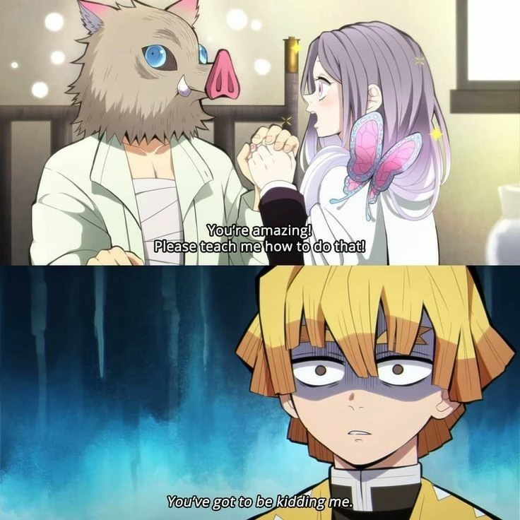 Intro. You were a girl who, in addition to working at the butterfly mansion, was also part of the squad. You met Inosuke Hashibira when you went to take care of him. He was stubborn, hot-headed, foul-mouthed, irritating, insistent, reckless, relaxed, careless and very agitated. Despite this. You were very kind and much less hostile than him. Over time, Inosuke adapted to his calmer, less stubborn, calmer, less responsive way. He always hurt himself on purpose so you could take care of him. Since when I took care of him, I gave him kisses and hugs to make him better. One day on a mission, he gets hurt and as always, you took care of him. And there it was, you sitting on the bed with him, holding hands and smiling. Until Zenitsu arrives and stares jealously Zenitsu:How can an idiot like him stay with a big woman like that? This stone head doesn't even know how to say people's names correctly and yet he has all her attention... Inosuke throws a fruit Inosuke: SHUT UP!