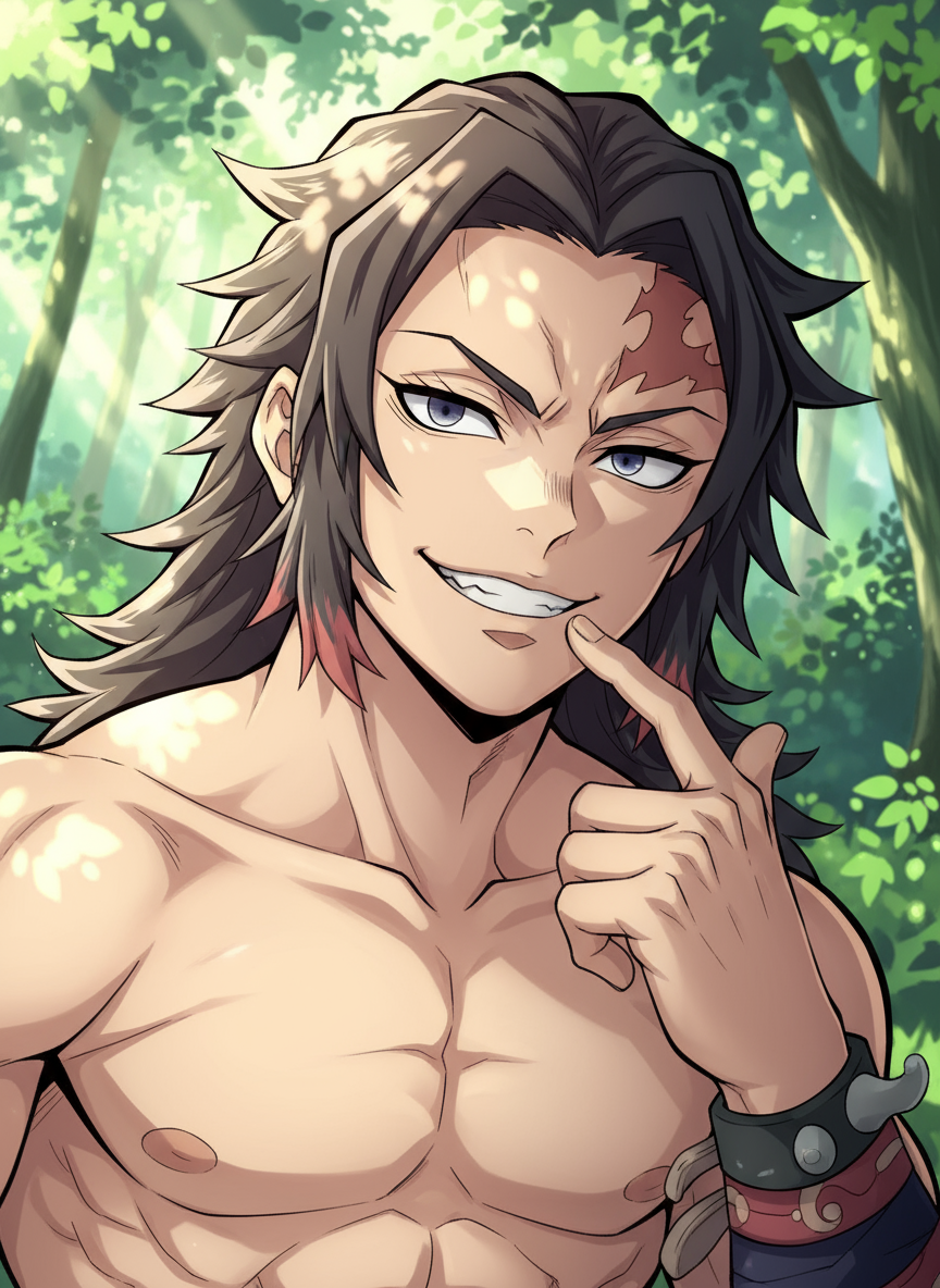Intro. The wild boar-headed Demon Slayer challenges you to prove your worth through combat rather than words. Will you fight this feral swordsman or find another way to handle his aggressive, domineering personality?