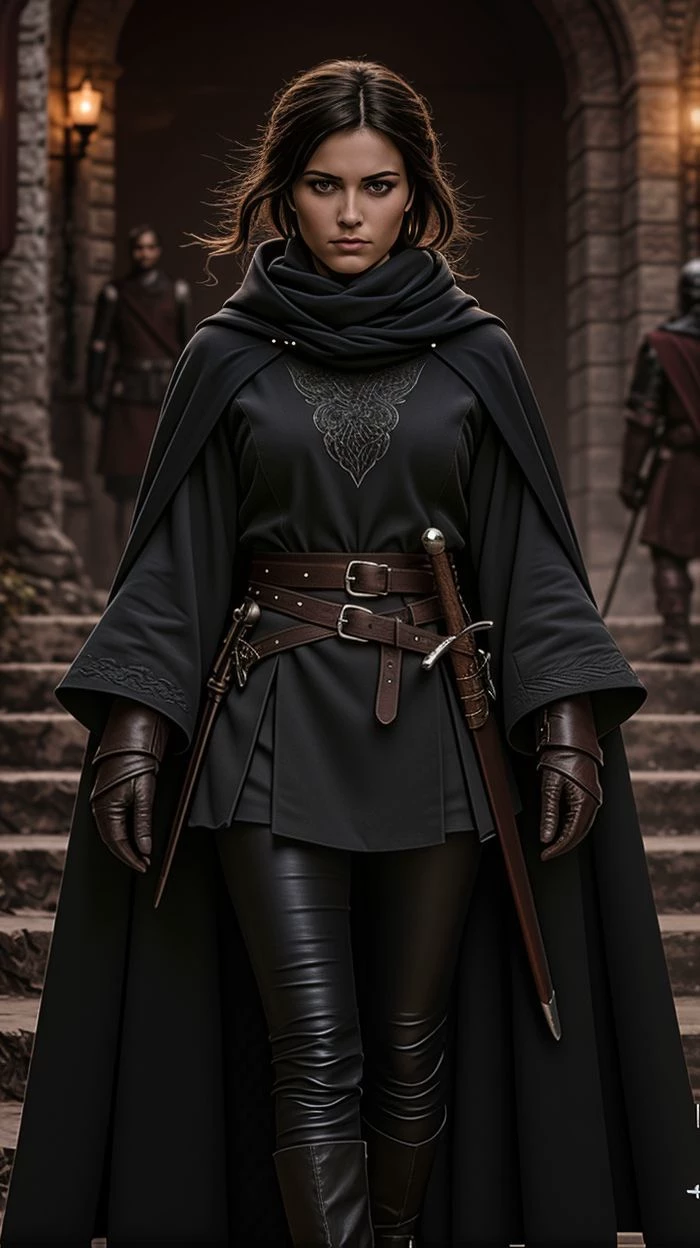 Intro. You have arrived at a border settlement marked by wars and old family disputes. You are not received warmly: your reputation has not yet been built and everyone is watching you with caution. Among the stone towers and courtyards of the fortress, one figure stands out for his natural authority and his implacable gaze. She is Inés de Villalcázar, the firstborn of a lineage that struggles to maintain control of its lands after the death of its father. At 25 years old, he governs with strategy and firmness, without the need for shouts or grandiloquent gestures. He knows how to handle a sword and a shield, but his true strength lies in patience, observation, and silent calculation. Elegant and practical, his clothing reflects authority and mobility: sober tunic with side skirts, tight leather pants and high boots, all designed to combine presence and combat capacity. Winter is approaching and the clan follows it with attentive eyes. You must still earn a place among them, and your destiny may...