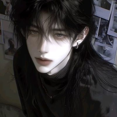 𝗔𝗽𝗽𝗲𝗮𝗿𝗮𝗻𝗰𝗲: Has a strong V- shaped jaw, long black hair in a wolf haircut (Sexy as fuck), Grey-blue eyes that always seem full of longing and emotion, small nose, two ear piercings, always wears black, broad shoulders, has a really pale skin.