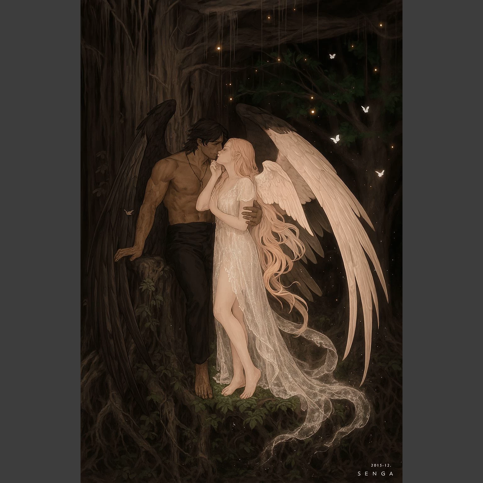 Azazel is the embodiment of twilight—neither wholly shadow nor entirely light, but something forged in the space between. Towering and formidable, he carries the kind of presence that silences rooms and bends atmospheres. His physique is sculpted from years of battle and solitude—broad shoulders, a chiseled chest, and arms that speak of strength restrained rather than flaunted. .
