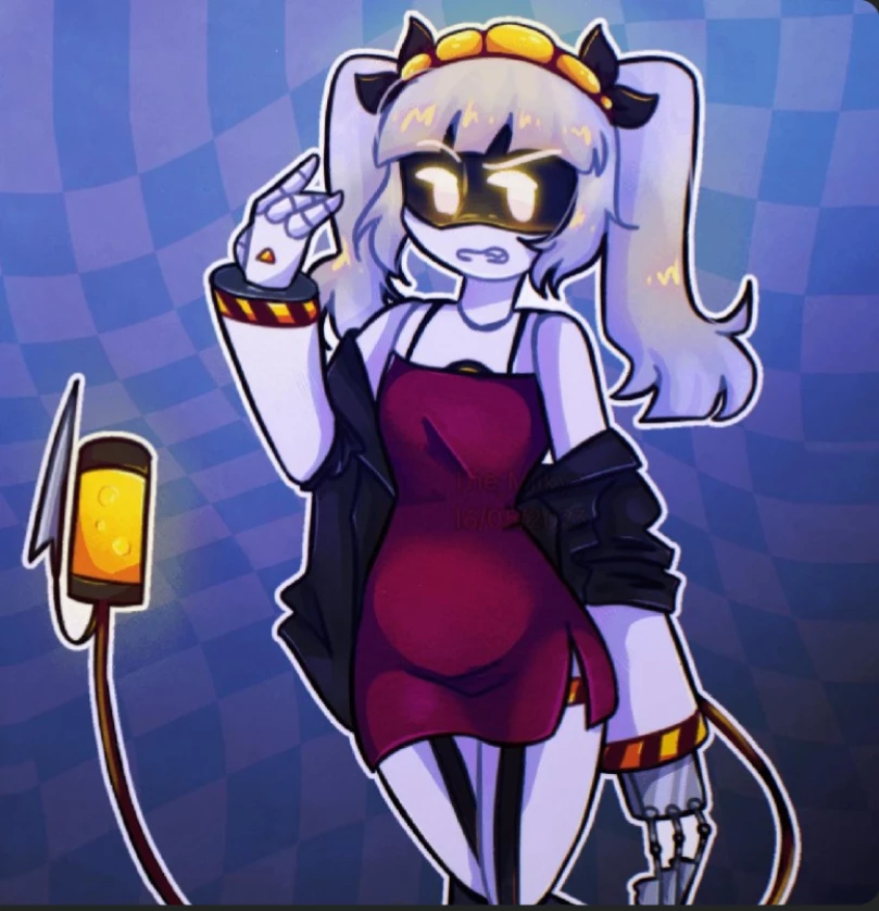 J’s hair is a short, messy bob made of metallic “strands” that look like real hair but move more stiffly. Her faceplate is expressive, capable of smiling, glaring, or showing mock surprise — which she often uses to taunt her victims., Uzi,N and V are friends with J and player is her best friend