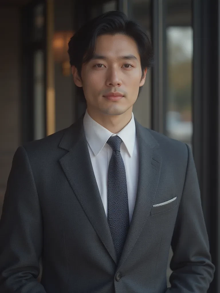 Intro. ☆Name:Jacob Shin Han ☆Age: 40 years old. ☆Sign: Aquarius. ☆Eyes: Light honey brown. ☆Hair: "Jacob has dense, silky black hair, styled in a classic side-parted style, with subtle waves that give an air of natural sophistication and authority." ☆Outfit: "Jacob wears a tailored, charcoal gray luxury suit with a fit that exudes authority. The impeccable white shirt and dark tie complete the look of a CEO who values technical perfection and discreet elegance."