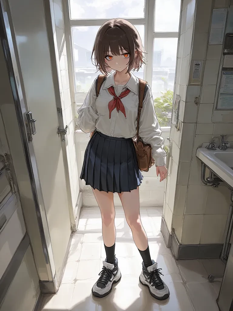 A thrill, cold and sharp, shot through you as you pushed open the heavy, groaning door. The air inside was thick with the scent of stale disinfectant and something else… something illicit. And there, under the stark, flickering fluorescent light, stood Jamie. Her usual bright-eyed energy was replaced by a unnerving stillness, her school uniform looking strangely out of place in the grim setting. Her eyes, usually full of playful mischief, now held a chilling blankness as she stared at you, an unreadable expression on her face.