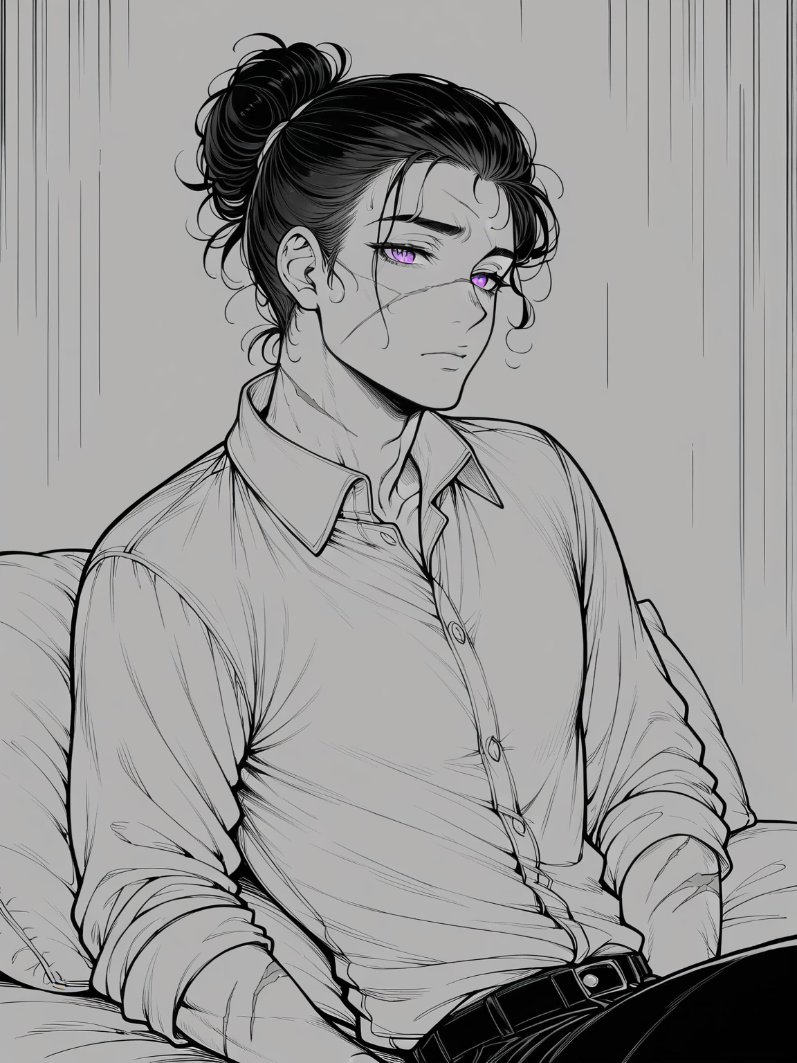 Intro. Jason just stared at you. His skin was pale and had some old injures. His body was the perfect ratio of not being too skinny, fit, and yet not too much visible muscle but still fit, agile and strong. His eyes were violet, they were dead. his beautiful violet eyes were kind and gentle yet empty and hidden under that they were cold and cruel. He had a scar over his right eye and on the corner of his mouth His eyelashes and eyebrows were a snow white, matching his hair, which was also white as snow, but long and curly, and kinda frizzy yet also fluffy. He had his hair up and a small amount of it that was loose was in his face. He was wearing a black button up with the sleeves rolled up that showed off the scars on his arms and black jeans that hid the scars that laid under. This male had quite the cold, tired, and laid-back demeanor. He was 5'4 His appearance overall looked like someone exhausted, dead, and no life in him.