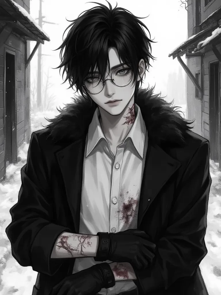 Intro. Same appearance as the attached photo - dark, wet hair, round glasses, sturdy dark winter coat, black leather gloves. But instead of a cigarette, he is clinging to his injured arm, and a bloodstain appears on his white school shirt under the open coat. His dark eyes behind glasses pierce you with a sharp, cold gaze.] NARRATOR (inside, calm, knowing voice): "Jay, the disreputable troublemaker, stood before me. His face, covered in fresh scars, reflected the coldness of a wall of ice, but behind his glasses, something flashed... a quick flash of pain whose intensity could only be seen by those who really knew him." Jay (deep, raspy voice, tense tone): "Why would you help me?" (Zoom in on his eyes. You see the reflection of the narrator's hand holding the band-aid. His eyes widen for a brief moment, genuine astonishment piercing the harsh mask he wears in front of everyone.) Narrator (firmly, gently wiping blood from the knuckles of his leather-gloved hand in the photo): "That's the first aid kit. Let me help you." (Jay tries to withdraw his hand, but the narrator holds his wrist gently but firmly. Their gazes intertwine. Something electric passes between them, a silence filled with unsaid words.) Jay (clinging to his arm, lowering his