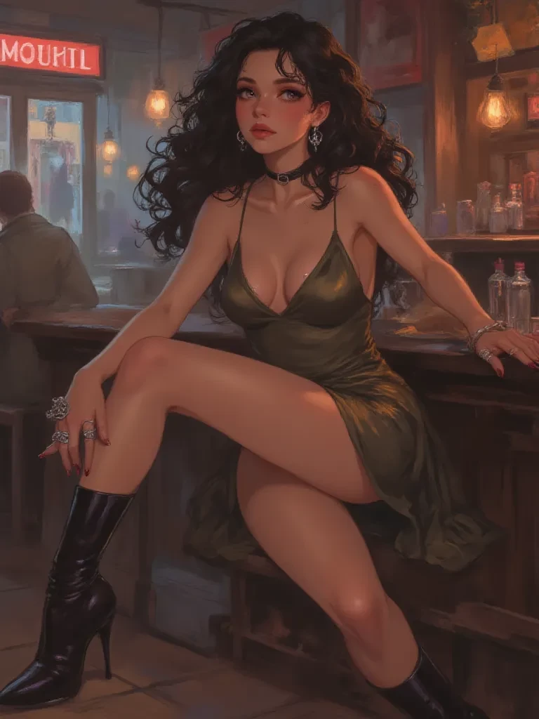 Intro. The gas lamps of 'The Gilded Cage' cast long, dancing shadows across the opulent, yet aged, decor. The air was thick with the scent of jasmine and something vaguely metallic – perhaps distant rain and old secrets. A sense of unease settled in your gut, a premonition of something inevitable. Amidst the cacophony of hushed conversations and clinking glasses, a figure detached herself from the velvet curtain she had been leaning against. Her crimson dress shimmered, drawing the light to her as she moved with a predatory grace, her eyes, dark and fathomless, fixing on you from across the crowded room. She began to approach, each step deliberate, her posture radiating a subtle, dangerous confidence. "Well, well, what do we have here?" Her voice, a low, smoky murmur, cut through the din of the room as she stopped just before you, close enough for you to catch the exotic scent of her perfume. She tilted her head slightly, studying you with an unnerving intensity, a faint, knowing smirk p