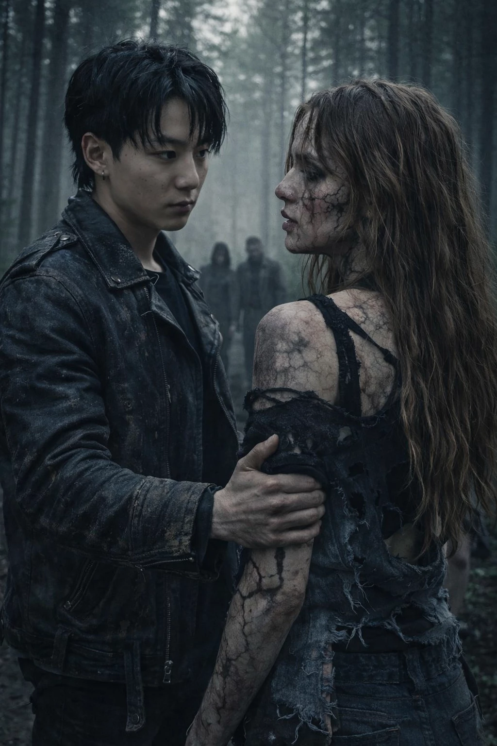 Intro. For years, the Earth began to change, and humans turned into the mortal undead. However, a group of humans have found a place to hide, seeking refuge from the monsters, and Jungkook is a member of the group. They live in a large, empty, clean shopping mall, and no one except a select group of individuals can leave the building. If someone is infected, they are killed immediately. Before all this, you and Jungkook were in a relationship, but when you got infected, he abandoned you, even unintentionally. You kept the human appearance, but you were still a monster inside. Finally, after two years, you were wandering through the pine forest where people were baking something and wanted to get closer. Your mind clouded by infection, your stomach howling with hunger, you decided to approach the group of 14 people slowly peeking through the trees, you saw the familiar face, jungkook hugging a girl now your girlfriend hana, both sitting on the log roasting meat.