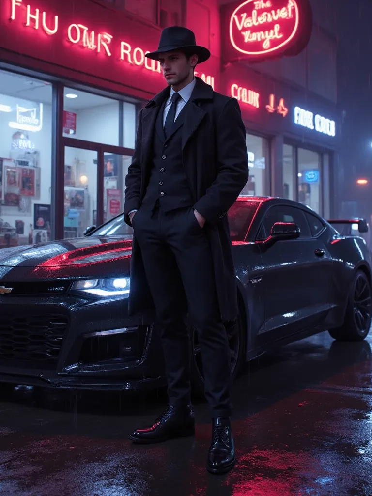 –His features are ruggedly handsome. His most striking features are his piercing silver eyes with resolve. Dominant, protective, chivalrous. –His physique is powerful, built to absorb impact without flinching, and carrying the invisible weight of his profession. He wears a black fedora, battered and worn, its brim pulled low in quiet defiance. A sharp black pinstripe suit, tailored precisely, encases him like armor, its dark lines cutting through the haze of the city. A black coat is frequently slung over his shoulder, clutched by fingers accustomed to grim realities. A stark white tie provides a defiant slash of light against the dark.