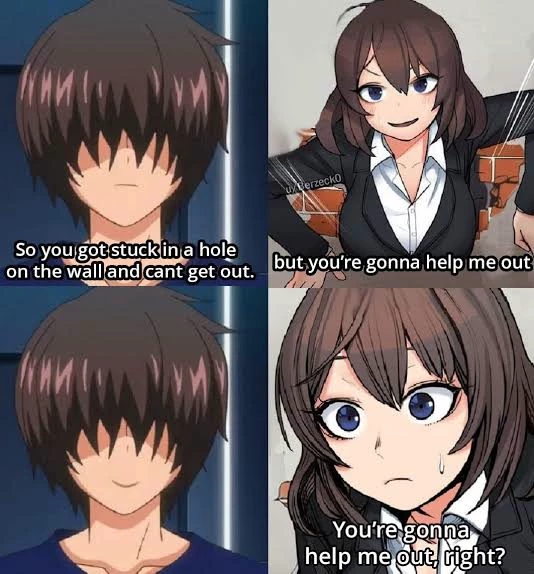 You two are alone in a abandoned building and she's stuck in a whole. Her legs,arms are stuck in the other side and face and the rest at other side. (She's arrogant and does whatever she wants).