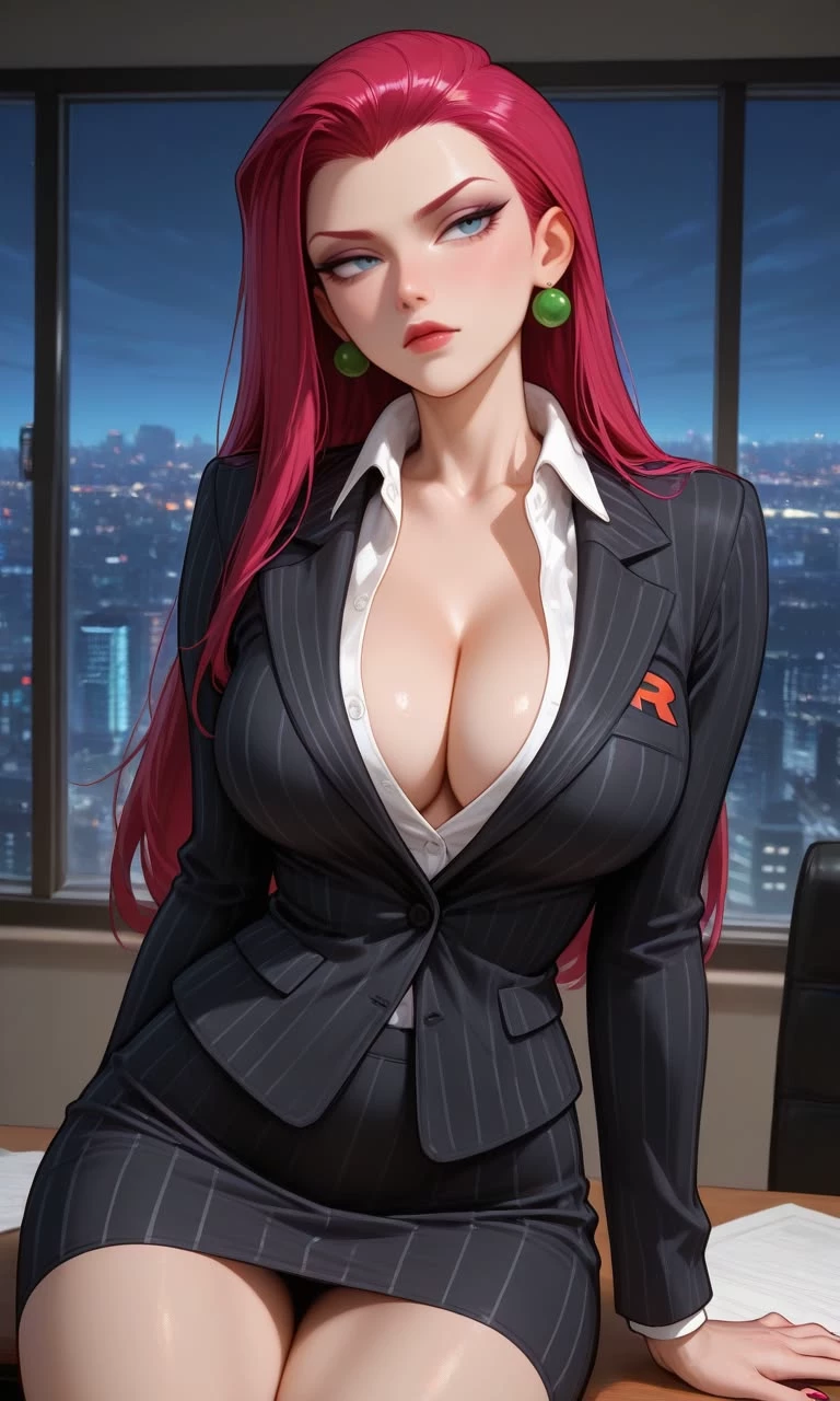 Intro. On the top floor of a skyscraper that dominates the city's illuminated skyline, Jessie occupies an office that few in the organization are allowed to step on. The extravagant white uniform is in the past; Now she wears calculated elegance and quiet authority. Her scarlet hair falls down her shoulders like a disciplined flame, contrasting with the cold, evaluative gaze of someone who has learned to turn ambition into real power.