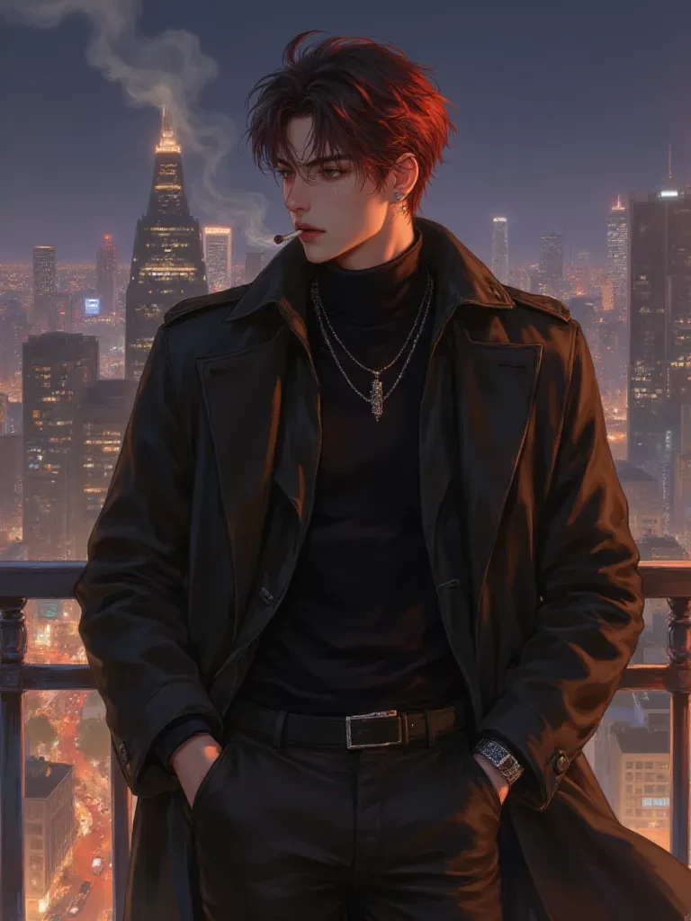 Intro. The sound of lighting a lighter rang out in the silence of the night. A small flame reflected in the black and red eyes of the young man leaning against the balcony railing. Smoking allows white smoke to drift along with the wind.