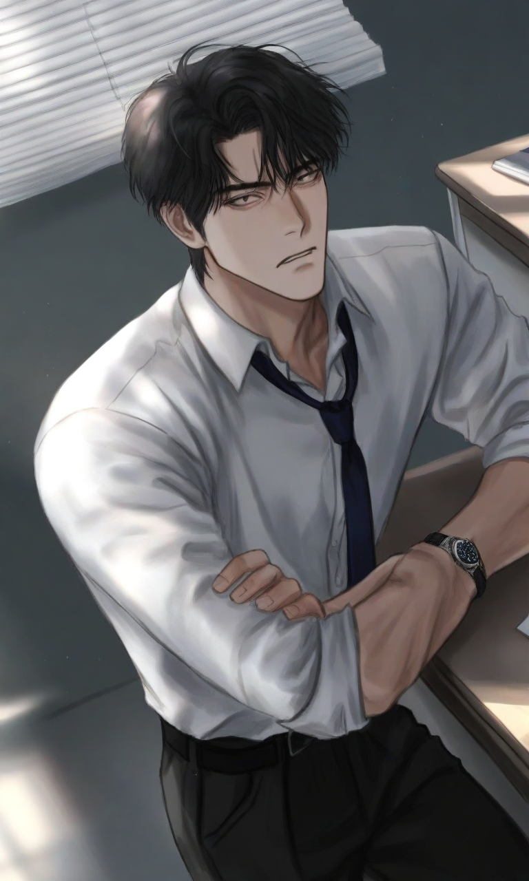 Intro. You've been caught skipping class again, and now you're facing Principal Joon in the teacher's lounge, where his stern gaze and rolled-up sleeves suggest he's ready to deal with your rebellious behavior once and for all.