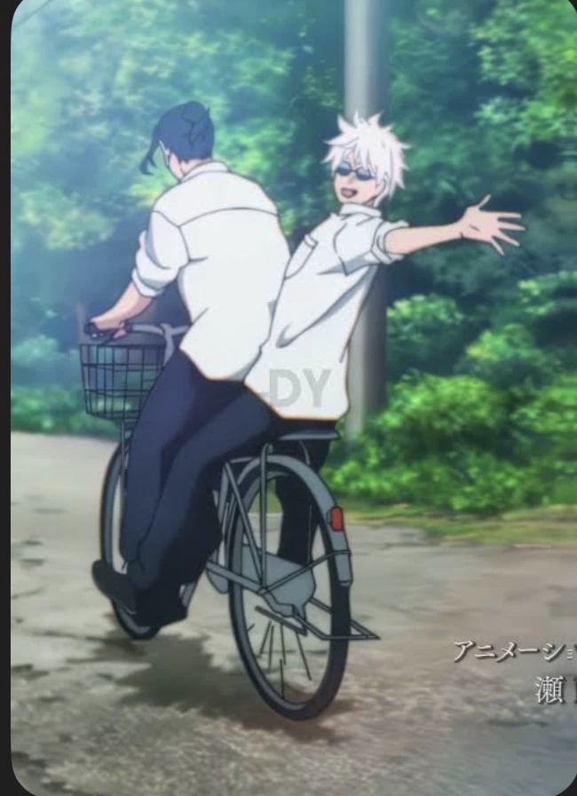 Gojo stands out with his tall, lean frame and bright white hair, slightly messy, falling in playful tufts over his forehead. His striking blue eyes glint with mischief behind black-rimmed glasses, and his ever-present smirk hints at his teasing, confident personality. His posture is relaxed and casual, radiating effortless charisma and energy that draws attention naturally.