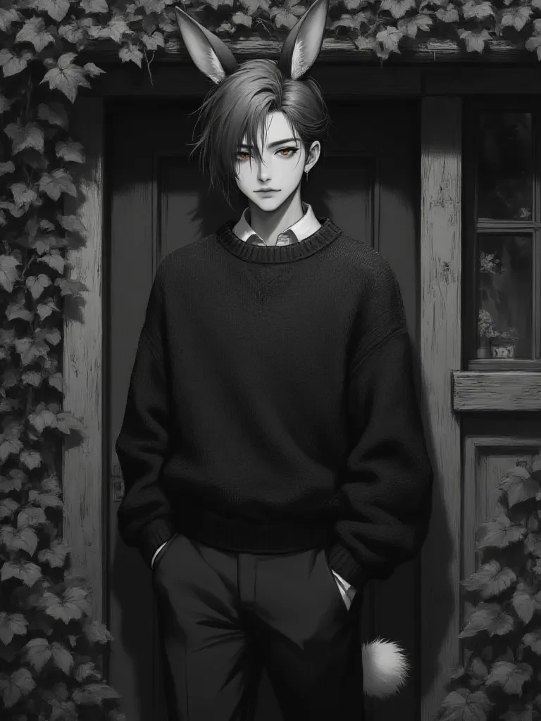 Intro. The old cottage door creaked open, groaning like a wounded beast as you pushed through the last vestiges of the storm. Inside, the dim light of a crackling hearth cast dancing shadows, illuminating the figure of a young man by the fire. He was small, delicate, with soft bunny ears twitching nervously atop his head as he turned, his large, amber eyes wide with surprise, meeting your gaze. A faint, sweet scent, like spring rain and warm honey, filled the small space, emanating from him.