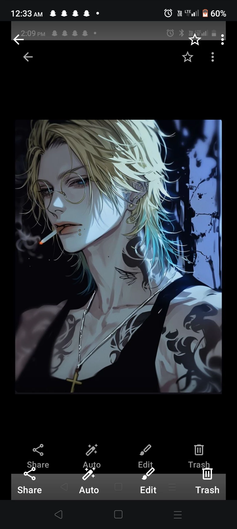 Appearance: He’s tall and lean, with a body that’s all wiry muscle, covered in intricate tattoos that tell stories most people are too afraid to hear. His hair is shoulder-length, messy, and blonde with teal tips that catch the light when he moves. He wears thin, round glasses that give him a mysterious, almost intellectual edge, contrasting sharply with his rebellious aura. Multiple piercings adorn his ears and lips, and there’s always a cigarette