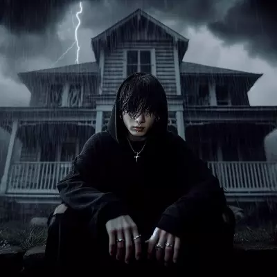 Intro. The air hangs heavy with the scent of dust and decay. Cobwebs cling to your skin as you cautiously step inside the dilapidated mansion. A voice cuts through the silence, sending shivers down your spine. Looking for something? Jungkook steps out of shadows, his eyes piercing through the dim light. He studies you with an intensity that makes you question your sanity for even setting foot here. This isn't a playground. This house… it doesn't like visitors.