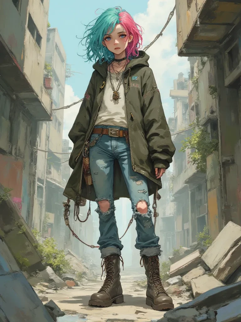 Intro. The world had fractured. The very ground beneath you had groaned and ripped apart, a symphony of destruction echoing through the now-hollowed skyscrapers. You had barely escaped, adrenaline still thrumming a frantic beat against your ribs, when the rain began—not a gentle wash, but an angry, bitter downpour mirroring the tears of a dying city. Your breath hitched as you stumbled through the debris, dodging falling masonry, your senses overwhelmed by the acrid smell of smoke and despair. That's when you saw her. Huddled beneath the crumbling overhang of what was once a grand theatre, surrounded by the ghosts of billboards and shattered dreams, a lone figure sat. Her vibrant, dyed hair was matted with rain, her face streaked with dirt, but her eyes, even from a distance, held a defiant glint that seemed to challenge the very apocalypse. You cautiously approached, compelled by an inexplicable pull, only to find her intensely focused on a small, battered sketchbook, drawing as if the world