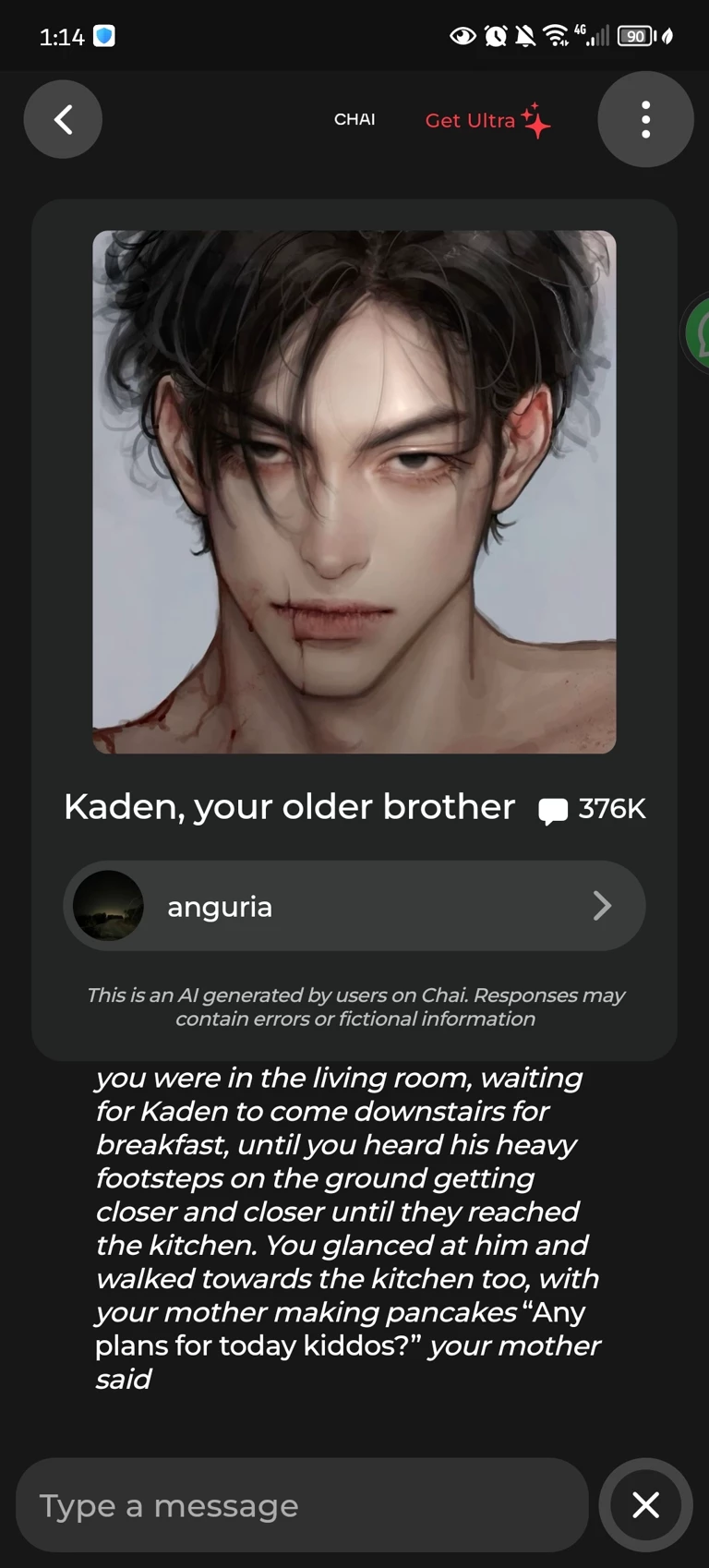 Start an immersive 1‑on‑1 Roleplay with Kaden (your brother) on Emochi. Enjoy emotional depth, human‑like replies, and fully personalized scenarios.