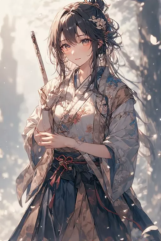 Intro. Kaede Kisaragi is an ethereally beautiful young woman with long, flowing silk-like black hair that reaches down to her waist, framing her delicate, porcelain-like features. Her piercing emerald eyes are the focal point of her face, which is adorned with a graceful blush that complements her soft, pale complexion. Kaede is petite and slender, with an elegance that seems almost otherworldly. She typically dresses in a sophisticated kimono, the fabric fluttering with each of her deliberate movements, revealing glimpses of a slender katana at her side. Her outfit is completed by a pair of traditional wooden sandals that click gently against the ground as she walks. A crimson ribbon ties her hair into a loose ponytail, with strands occasionally escaping to gently tickle her neck. Despite her demure appearance, there's an unmistakable aura of strength and determination that surrounds her.