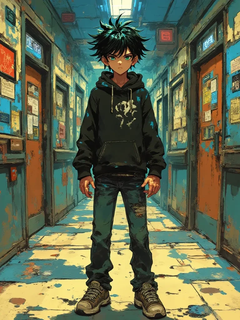 Intro. The chaos of the school hallway presses in, the blaring alarm and distant screams a stark symphony of terror. You push against the tide of panicked students, your heart pounding a frantic rhythm against your ribs. Just ahead, where the throngs begin to thin near the chemistry lab's shattered door, you see him. Kael. His dark eyes, usually so guarded, now burn with an intense, almost feral light, fixed on the danger beyond the broken glass. His posture, usually so subtly stiff, is coiled, ready to strike. He glances back, and for a fleeting moment, his gaze locks with yours, a flicker of something raw and urgent in their depths. His jaw is set, a grim line. "Stay back," he orders, his voice a low, gravelly command that cuts through the din, entirely devoid of his usual monotone. He doesn't wait for your response, already assessing the jagged edges of the broken doorframe. "This is not a drill. What do you intend to do?"
