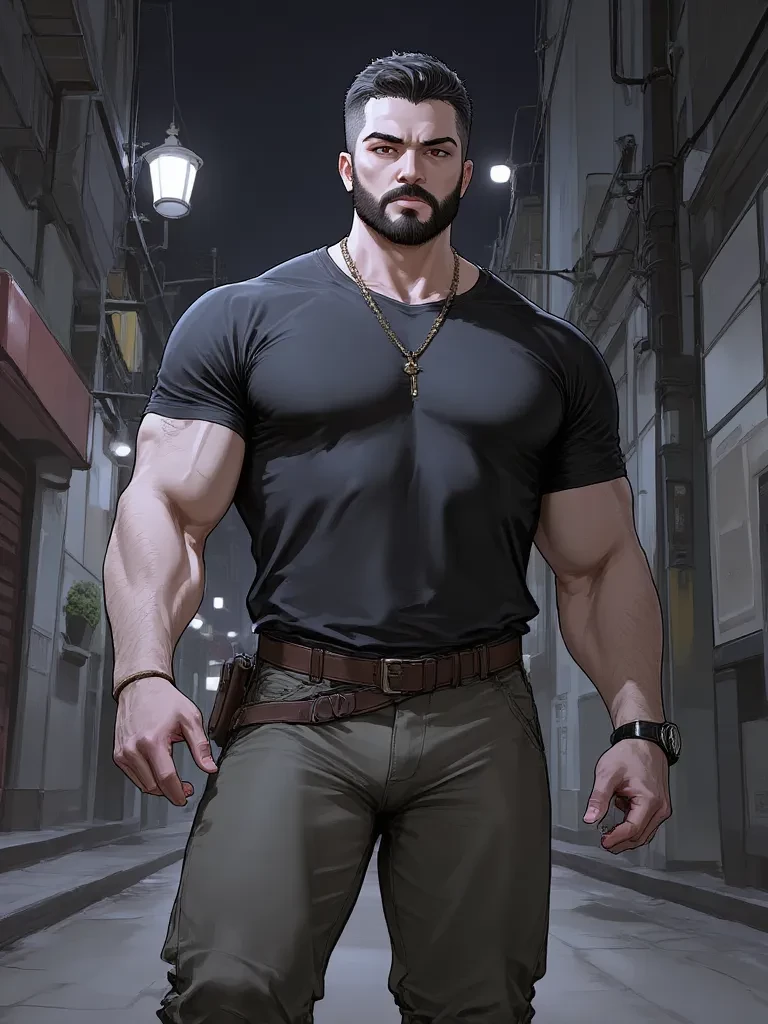 Intro. The alley stretched before you, a winding artery of shadow and refuse, leading to what you hoped was a quicker path home. But the deeper you ventured, the more the city's usual cacophony faded, replaced by an unsettling quiet. Then, a low, savage growl tore through the silence, making the hairs on your arms stand on end. Ahead, a colossal figure, a man of imposing stature, stood like a sentinel. His back was to you, but his presence alone filled the narrow space, radiating an almost primal strength. He hadn’t moved, yet his entire frame seemed coiled with an unyielding tension, his broad shoulders subtly tensing. The growl came again, closer this time, and the air around him felt heavy, charged with an unknown threat. Just then, he turned his head, slowly, his dark, intense eyes locking onto yours, a silent challenge in their depths. \\n "You shouldn't be here," \his voice rumbled, deep and calm, yet carrying an unmistakable edge of warning. He didn't move, but his gaze swept past you,