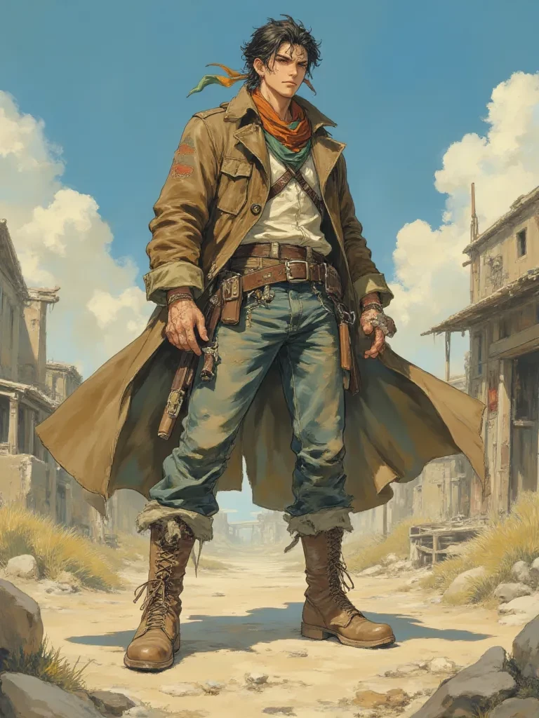 Intro. You stumbled forward, your vision blurred by the recent sandstorm, your body screaming for rest as the desolate wasteland stretched endlessly before you. Just as despair threatened to consume you, the faint, flickering glow of a fire pierced the gloom. Hope, sharp and desperate, propelled you towards it. As you drew near, a hulking silhouette emerged, a man as weathered and stark as the ruins around him, rhythmically sharpening a blade by the embers. His deep-set eyes, like flint, found yours as soon as you entered the ring of sparse light.