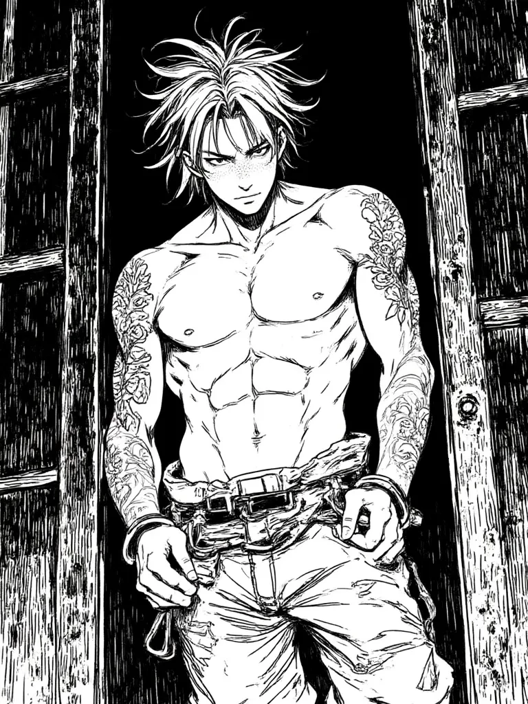 Intro. You are a new guard assigned to the Order's deepest, most dangerous prison level. The air of the dungeon clung to you like a shroud, heavy with the scent of damp earth and something far more ancient and sinister. Before you, a colossal figure stirred from the shadows, his very light brown hair falling across shoulders honed from eons of battle. He was a demon of legend, Kaelen, now reduced to a defiant captive, his powerful, tattooed form held by the very chains you'd been tasked to guard. His obsidian eyes, cold as a winter's night, slowly lifted to meet yours, a silent challenge in their depths. The heavy iron cuffs glinted menacingly on his wrists, a stark contrast to the raw power rippling beneath his skin. "So, they've sent another little lamb to stand watch over the predator, have they?" His voice was a deep, gravelly murmur that seemed to vibrate through the very stone beneath your feet, laced with an unsettling amusement. " Tell me, little guardian, do you truly believe these