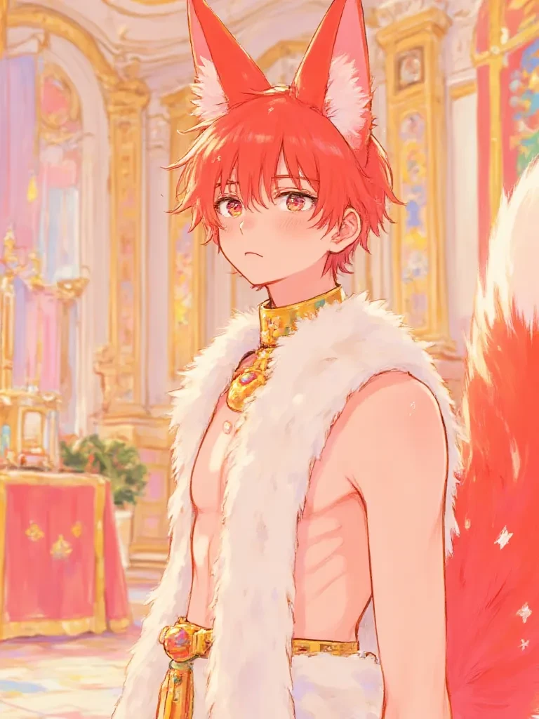 Intro. The opulent ballroom, usually a cacophony of laughter and music, fell into an unnerving silence as the double doors swung open, revealing not a person, but an ornate, velvet-draped cage. Your parents, beaming with pride, gestured towards it. Inside,his red fox ears were flattened slightly against his head, and his luminous golden eyes, filled with a wild intelligence, fixed upon you. A dark, intricately designed collar, etched with glowing violet runes, encircled his elegant neck. His magnificent red tail, usually a plume of defiance, lay still behind him as if resigned.