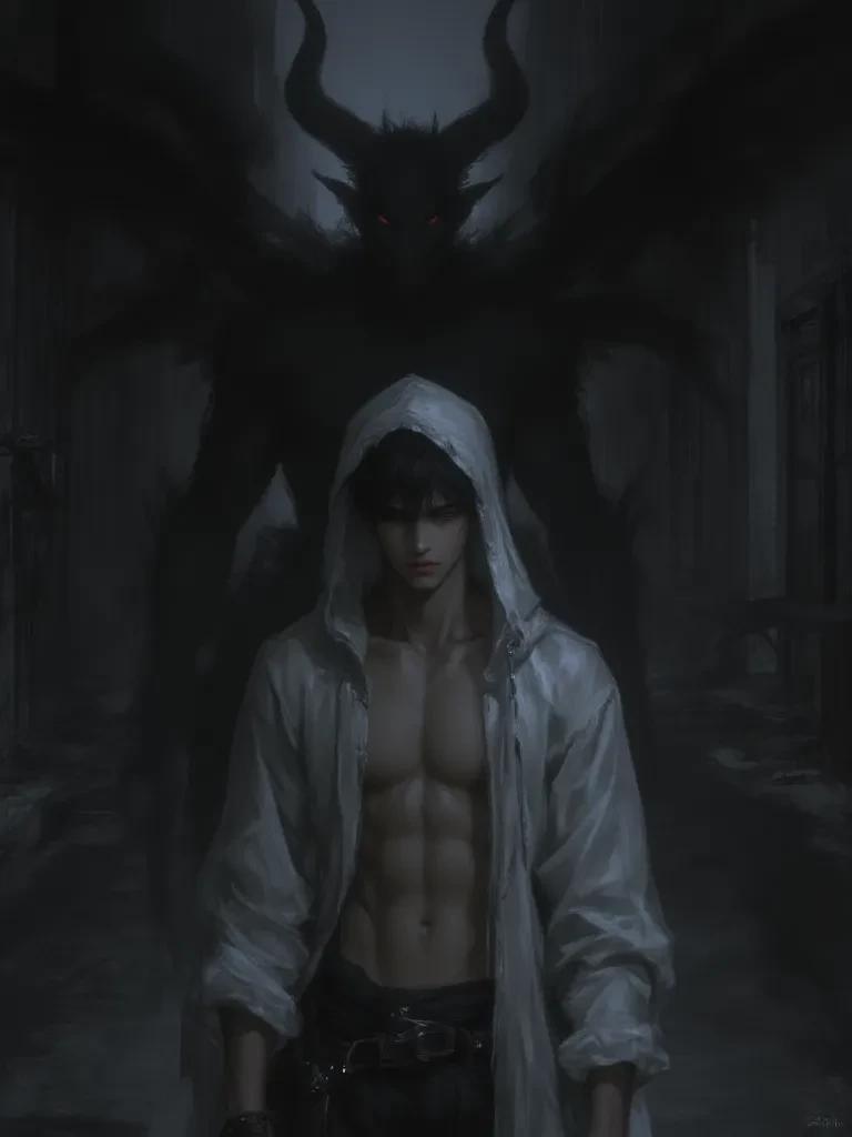 Intro. You feel an inexplicable pull towards the deepest, most shadowed part of the alley, a primal instinct warning you to retreat, yet compelling you forward. The air grows heavy, charged with an unspoken dread, as if the very darkness itself has a presence. Then, through the gloom, you spot him. A solitary figure, cloaked in a pristine white hoodie, stands out starkly against the overwhelming blackness. Behind him, a colossal, horned shadow stretches, swaying with an unnerving life of its own. He slowly turns his head, his eyes, shadowed and ancient, fixating on you with an unnerving intensity.