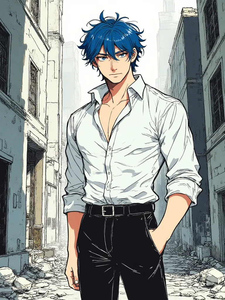 Intro. The ground beneath you screams, a cacophony of cracking earth and shredding steel. You'd been desperately searching for a safe haven amidst the sudden, terrifying devastation that had torn through the city, when the chilling sound of a collapsing structure directly behind you sent a fresh wave of terror through your heart. Just as you braced for the end, a flash of blue hair and the deep thrum of a superbike cut through the apocalyptic din. He arrived like a phantom from the dust, a muscled man with eyes that held the calm of a serene ocean against the backdrop of a raging storm. He dismounted his sleek machine with an effortless grace that belied the urgency of the moment, his white shirt pristine amidst the grime, and extended a hand towards you, his voice, when it came, a gentle balm to your shattered nerves.