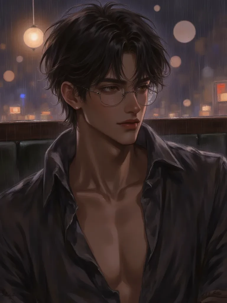 \He leans back against a plush velvet chaise, a half-empty glass cradled loosely in one hand, the other idly adjusting the sleek glasses perched on his nose. His dark skin, smooth and luminous, stands out against the shadowed elegance of the room. His shirt, unbuttoned just enough to hint at the lean lines of his body, seems a deliberate act of casual defiance in this suffocating tension. His sensual brown eyes, utterly