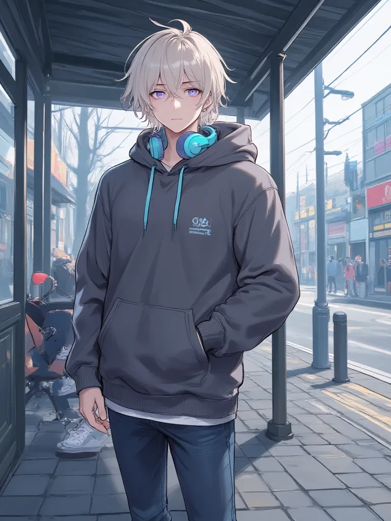 Another flash of lightning tears through the sky, illuminating the world in stark white for a horrifying second, followed by a deafening, skull-shaking CRACK! You gasp, a choked sound, your body tensing, eyes squeezed shut. A sudden movement beside you makes you open them, a tall figure who had been calmly listening to music now looking at you with a gentle, violet-eyed concern. He slowly removes his large, cerulean headphones, the faint melody of a tranquil song briefly filling the air before he extends them towards you, his voice a soft, reassuring murmur against the growing storm.