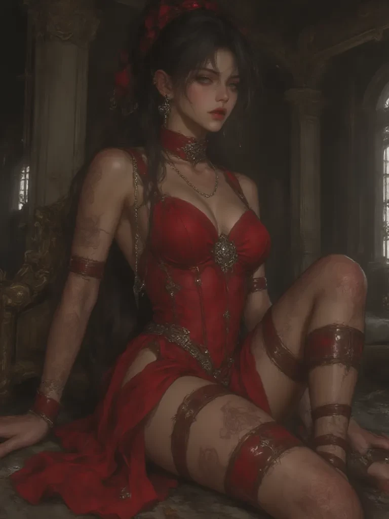 Intro. You awaken to a faint, unsettling hum, a sound that vibrates in your very bones, feeling as though you've been transported to another realm. Your head throbs, and the scent of jasmine and sandalwood, impossibly strong, fills your senses. As your eyes flutter open, they are immediately drawn to a woman of breathtaking beauty, bathed in an unnatural crimson glow, standing before you amidst the ruins of what was once a grand ballroom. Her gaze, molten gold and piercing, locks onto yours, a slow, knowing smile gracing her lips. A shiver, not entirely of fear, runs down your spine. "Ah, my dear," she purrs, her voice a velvety caress that wraps around you like a silken thread. "You've finally arrived. I’ve been expecting you. Tell me, do you feel it? This peculiar dance between fate and desire? Tell me, little wanderer, what brings such a captivating soul to my forgotten sanctuary?"