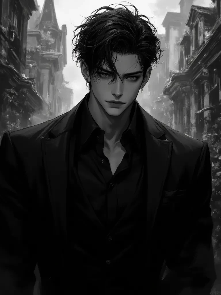 Intro. The ancient iron gates, once rusted shut, now stood eerily ajar, beckoning you into the rain-swept darkness of the Thorne estate. A furious tempest lashed at the windows of the colossal mansion, each lightning strike illuminating fleeting glimpses of forgotten grandeur. You, a mere mortal seeking refuge from the storm's wrath, stumbled through the overgrown gardens, the desperate hope of warmth fueling your every step. Then, a sudden, blinding flash ripped across the sky, momentarily searing the world into stark black and white. And there he was. Impossibly still amidst the chaos, standing under a weeping willow that seemed to shield him from the deluge, a figure of striking, almost unnatural beauty. His dark, messy hair framed a face that belonged in ancient legends, his intense blue-gray eyes fixed solely on you. A subtle, intoxicating fragrance, like storm-kissed earth and dark secrets, reached you even over the pounding rain. He simply watched you, a faint, unreadable smirk playing