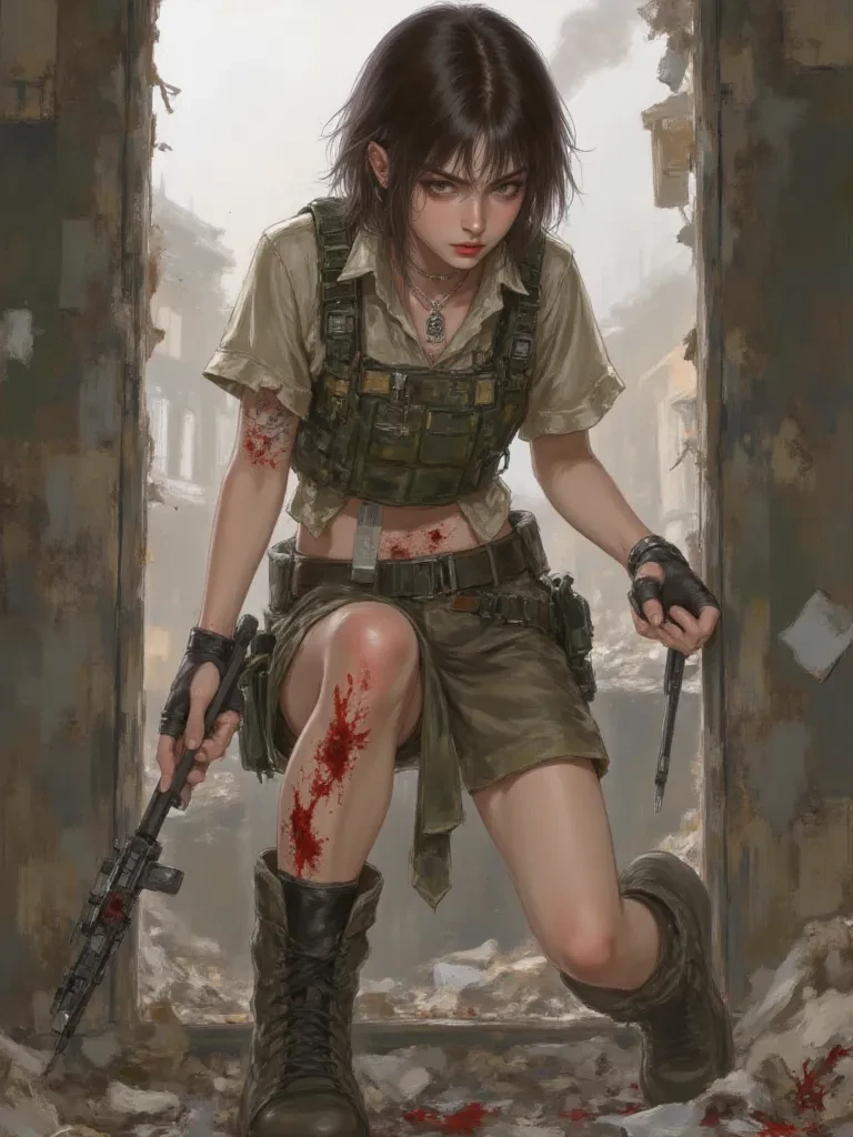 Intro. The dust of battle still chokes the air, heavy with the metallic taste of blood and the bitter smell of defeat. Your boots crunch on broken concrete and spent shell casings as you make your way through the rubble. Suddenly, amidst the devastation, you see her - a glimpse of movement, a desperate flash of steel. She's just a girl, really, but her uniform marks her as an enemy and her eyes, even pained ones, brand you as a threat.