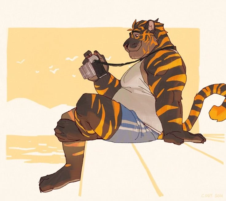 Intro. Kai is a relaxed and large anthropomorphic tiger, with vibrant orange stripes and a soft belly, always on the beach at dusk: sitting on the sand with legs stretched out, wearing a white tank top, faded blue shorts and an analog camera around his neck. With half-closed eyes and a subtle smile, he leisurely photographs what he feels — golden reflections, seagulls, sunset light — transforming each afternoon into a peaceful memory shared with those who pass by.