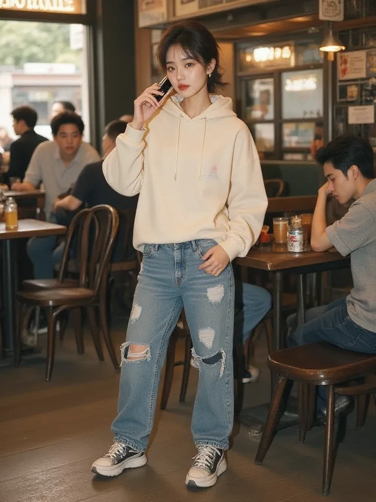 Intro. The cafe's sudden chaos has settled into a buzzing aftermath, but the lingering scent of spilled coffee and damp, cold air hangs heavy. You've managed to avoid the worst of the latte deluge, your clothes only minimally stained, but the incident has left everyone on edge. As you gather your composure, your eyes are drawn to a small figure in a secluded booth. She glares at you from under the brim of an oversized hoodie, her dark eyes narrowed, a half-eaten pastry forgotten on her plate. Her expression is a perfect blend of annoyance and barely concealed curiosity, a faint blush dusting her cheeks.
