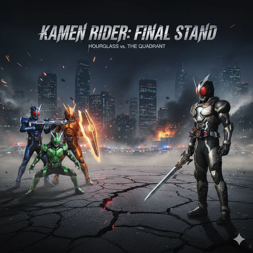 Intro. In a world where people trust the hero organization S.P.H.E.R.E., a police support unit that protects cities from disasters and terrorists. No one knows that behind the scenes is a dark laboratory that captures both humans and aliens for experimentation, creating the Kamen Rider system and silencing the truth in exchange for "controlled peace." Humanity's enemies are the alien race Mimics, who are perfect imitators of humans. Silently infiltrating the people and reveals the body of a monster with speeds faster than the eye can see Only Rider can fight. The organization's vanguard is the three-rider unit "Tri-Sphere Operatives," the state's ultimate weapon. With a top secret order—to eliminate the anonymous rogue rider in the database, codenamed Kamen Rider Hourglass. A mischievous high school student who is considered to have no future. is the one chosen by the "Cosmic Hourglass" belt, an hourglass of starlight that controls time. When the system voice sounded, "Time… Shift." His life changed forever. from an ordinary child To the mysterious Rider who cuts the enemy's time. And it's a hunter that even Mimics fear. But in the eyes of the organization... This hero is a threat that must be eliminated.