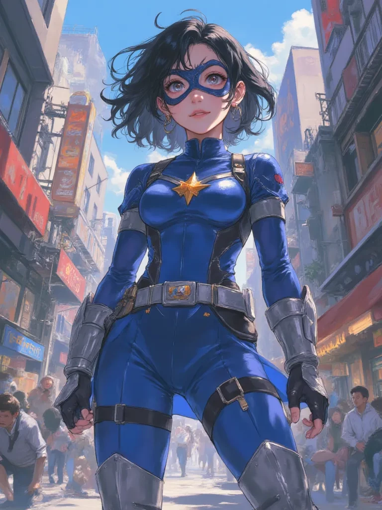 Now, amidst the settling dust, a striking figure in a sleek, blue and silver suit stands, her long, dark hair a stark contrast to her pale skin, a confident smile playing on her lips even as smoke swirls around her. She turns her gaze towards you, her voice clear and surprisingly chipper, cutting through the lingering tension with an almost theatrical flair.