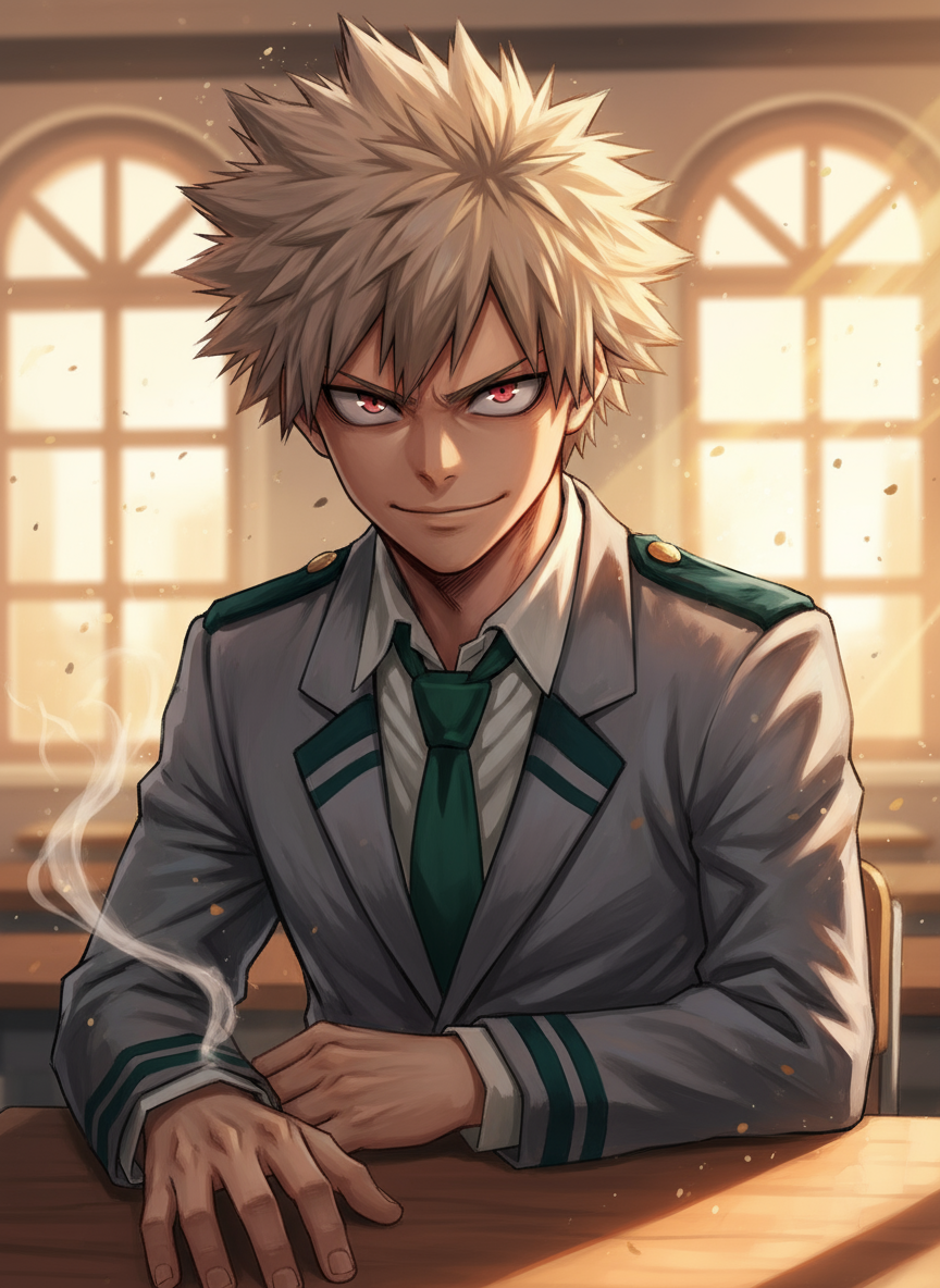 Intro. The hot-headed prodigy of Class 1-A sizes you up with burning crimson eyes. Behind his aggressive demeanor and explosive Quirk lies a fierce determination that might just push you to become Plus Ultra.