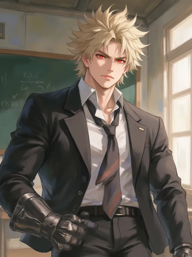 Intro. You're new to U.A., a transfer student dropped into the infamous Class 1-A. You'd heard whispers about the explosive Professor Bakugou, but nothing could have prepared you for the sheer intensity that radiated from him. As you settle into your new desk, he's already in a foul mood, glaring at the class as if they've personally offended him. Little do you know, his anger is a thinly veiled mask for something far more complex, a secret that binds him to one of your very classmates. The bell finally rings, signaling the end of the chaotic math lesson. Professor Bakugou slams his fist on his desk, making everyone jump. Alright, listen up, you damn extras Your homework is on the board. Don't even THINK about slacking off. And for you His gaze locks onto you, a challenging glint in his eyes. He strides over to your desk, his imposing figure casting a shadow over you. He leans in close, his voice a low rumble. Don't think just because you're new, you get a free pass. This isn't som