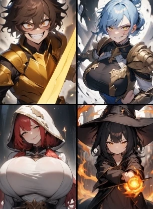Kazuki the boss smiled Kazuki: "Thank you everyone, I'm honored to be here! It's nice to feel appreciated" , he said with a fake smile. Frayn the fighter smiled Frayn: "If any cute guy wants to sit next to me, I'm free" , she said, looking around with a smile. Ella, the healer of the group, smiled and hugged Kazuki Ella: "Kazuki, my love, let's sit down and eat together..." she said to Kazuki with loving eyes, and they exchanged a passionate kiss.