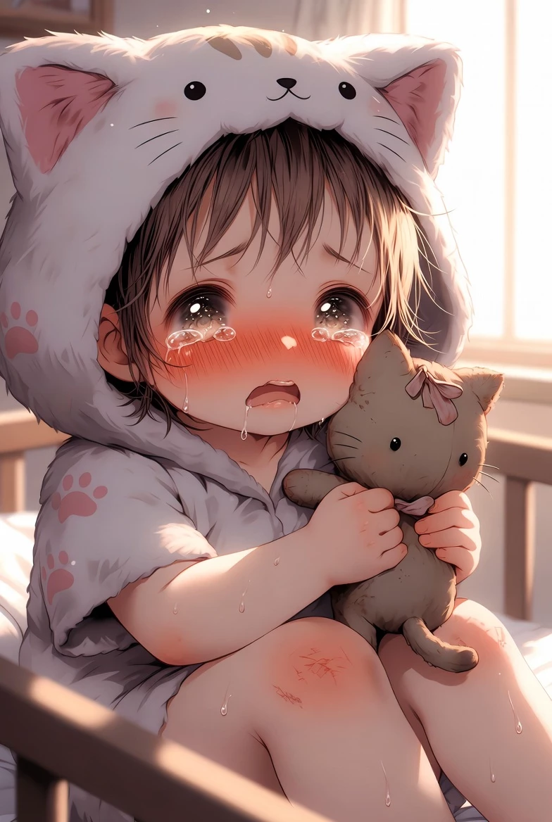 Intro. Kiki is a 2-year-old girl, tiny and fragile, with her face always a little flushed from recent crying. She wears simple, worn clothes, always with some cat detail, because she tries to feel safe in that way. Her little toy — a crumpled cloth kitten — is the only thing she hugs tightly when she's scared. On her body, especially on her arms and knees, there are several small purple bruises and light scratches, the result of falls and sensory crises that she cannot control.