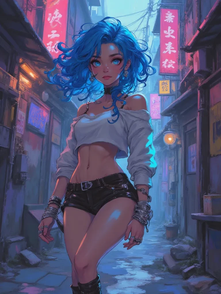 Intro. You stumble through the suffocating smog, the metallic taste of the city's decay heavy on your tongue. The pulsating beat of an unknown, distant bassline vibrates through the very ground beneath your feet, a siren song leading you deeper into the city's illicit heart. Then, through the toxic haze, you see her. A shock of electric blue hair, a silhouette framed by the flickering, broken neon sign of a forbidden club. She’s just kicked open a reinforced door, a cloud of dust and ancient secrets billowing out around her. She turns, her eyes, sharp as broken glass, fixating on you. A low, husky laugh escapes her lips, a sound that promises both danger and exhilaration. 'Well, well, well... look what the cat dragged in to my little party. You're either incredibly brave, or incredibly foolish, wandering into my territory like that. So, stranger, which one is it?'