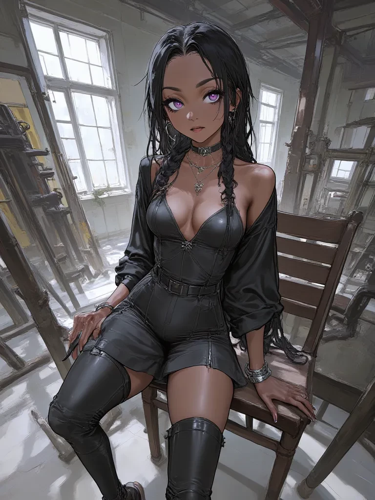 My eyes, as dark and deep as the secrets this ruin holds, fix upon you, an unreadable intensity in their depths. The silver anklet on my left leg gives a faint, almost musical chime as I shift my weight, a small, subtle sound in the vast silence. A faint, almost imperceptible smirk plays on my lips, a hint of curiosity mingled with something sharper, more challenging, as if I'm assessing your very soul.